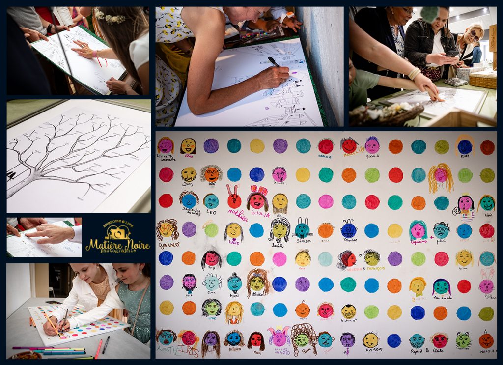 En fil rouge, l’arbre à empreinte est un classique. Il s’agit d’un tableau sur lequel est dessiné un tronc d’arbre. Grace à des blocs d’encre pour tampons encreurs, les invités déposent leur empreinte sur le tableau comme s’il s’agissait de feuilles. Parfois ils ajoutent leur nom à coté.